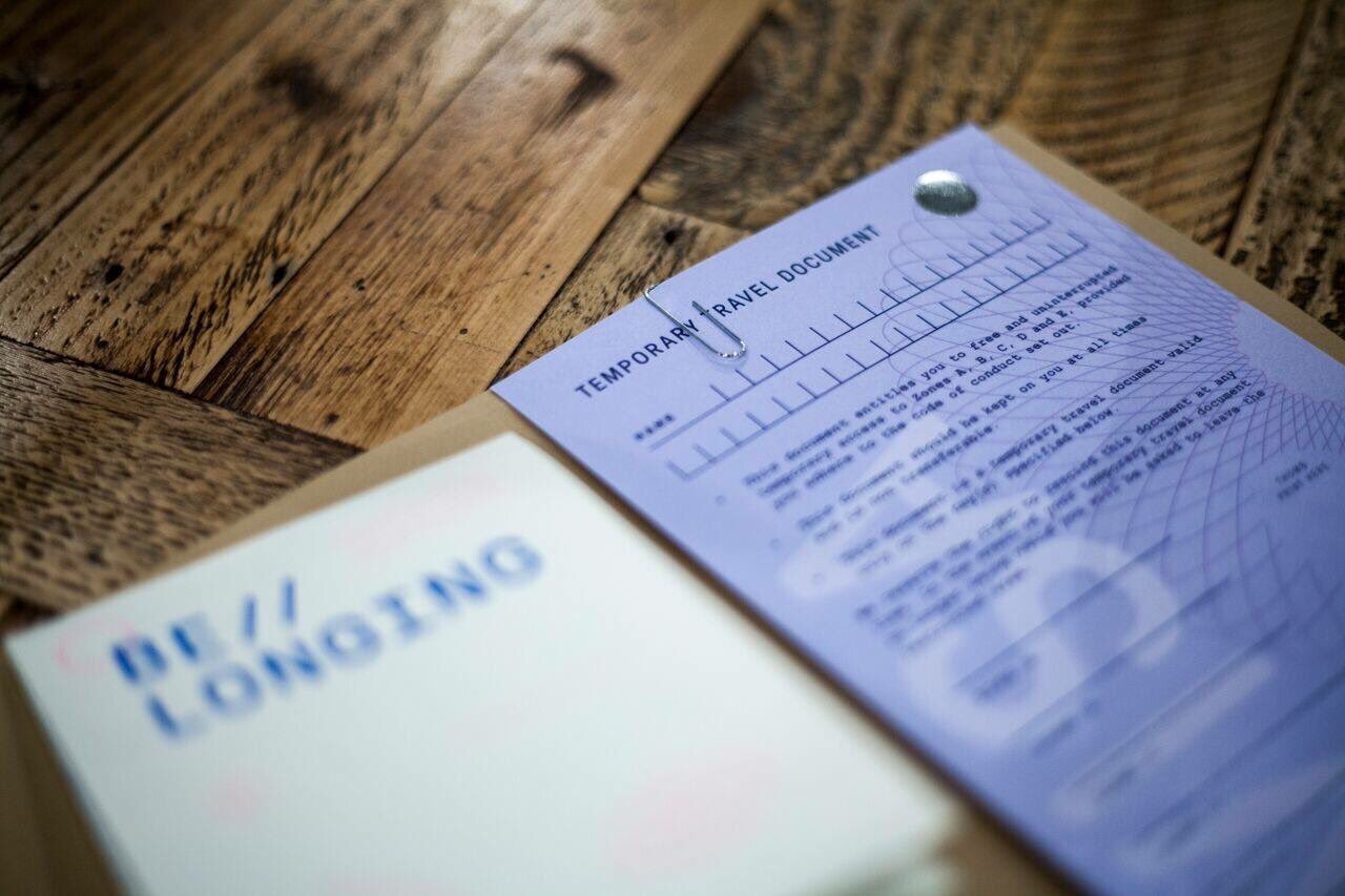 Upon arrival each audience members papers are checked and a temporary travel document approved which we must carry with us at all times. We are then given a map allowing us to navigate as we cross the border into Hope Mill Theatre. The theatre space has been transformed to resemble a warehouse on the edge of the border, boxes are piled up, labelled to indicate types of clothing, ages, sizes etc ahead of distribution . Telephones dotted around the theatre allow audiences to listen in on personal & deeply moving migrant stories , a recording of a Syrian refugee speaking to an Italian Coastguard as a boat sinks, an account of life as a detainee in Yarl’s Wood Detention Centre, the stories are multiple and varied.